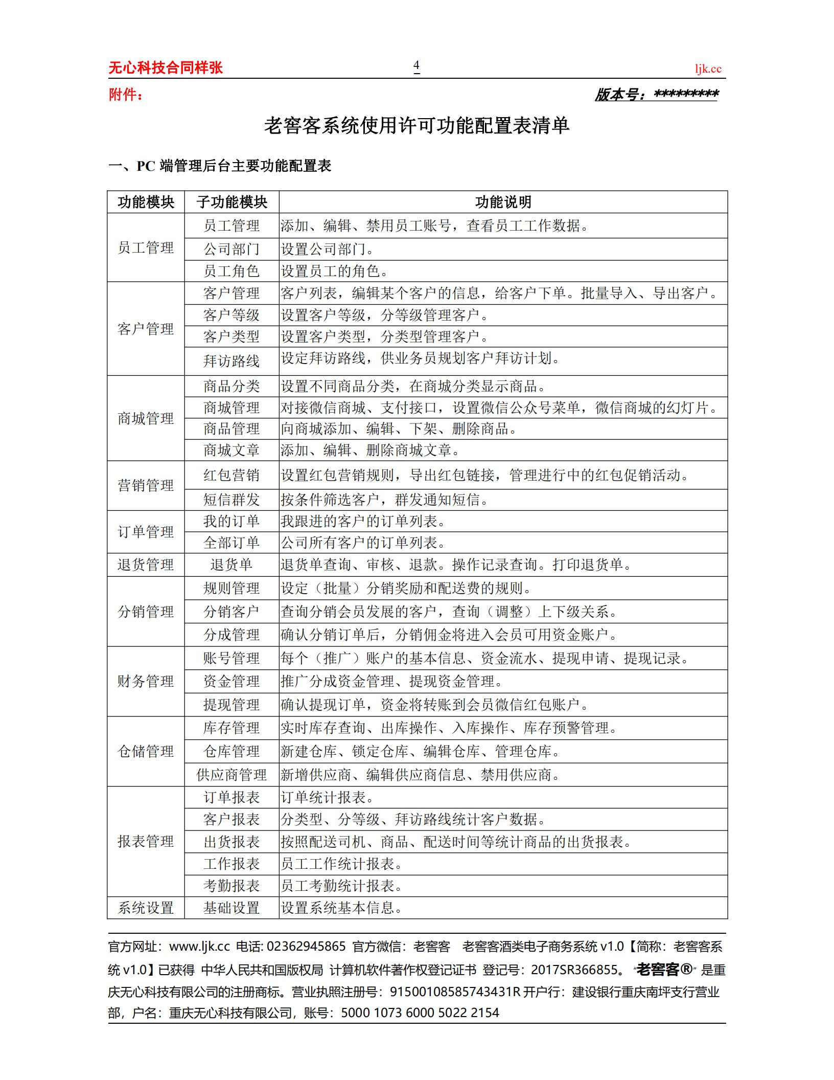 企业和重庆无心科技有限公司签订《软件使用许可授权合同》购买老窖客系统标准版,无心科技交付软件激活码和《老窖客软件使用说明书》,由企业自主激活系统实施上线或购买简易上线服务包,由无心科技客服人员完成系统配置,上线完成。