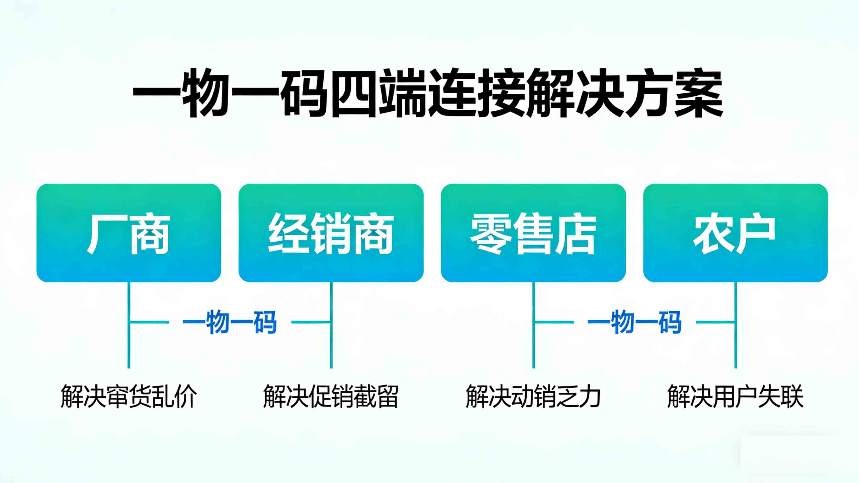用一物一码+实时红包,打通厂商→经销商→零售店→农户四端,解决农药行业窜货乱价、促销截留、动销乏力、用户失联**四大死穴,把每一分费用花在刀刃上。